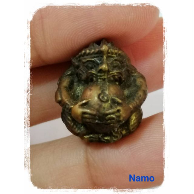 พระราหูอมจันทร์ กะลาตาเดียว แบบที่เป็นมาตรฐาน หลวงพ่อน้อย วัดศีรษะทอง ราหูอมจันทร์. ราหูอมจันทร์เมื่อพิจารณาศิลปะการแกะ, อักขระการจารแล้ว สุดท้ายต้องความเก่า ราหู อมจันทร์ที่ผ่านการใช้จะมีรอยเหี่ยวย่น.